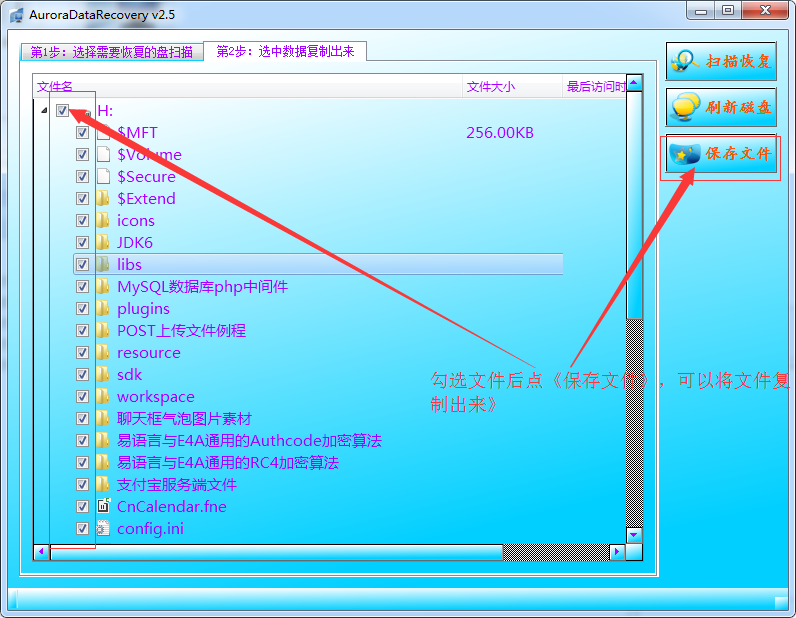 步骤4:勾选所有需要恢复的文件,接着点右上角的保存,《文件保存》按钮,将勾选的文件复制出来。