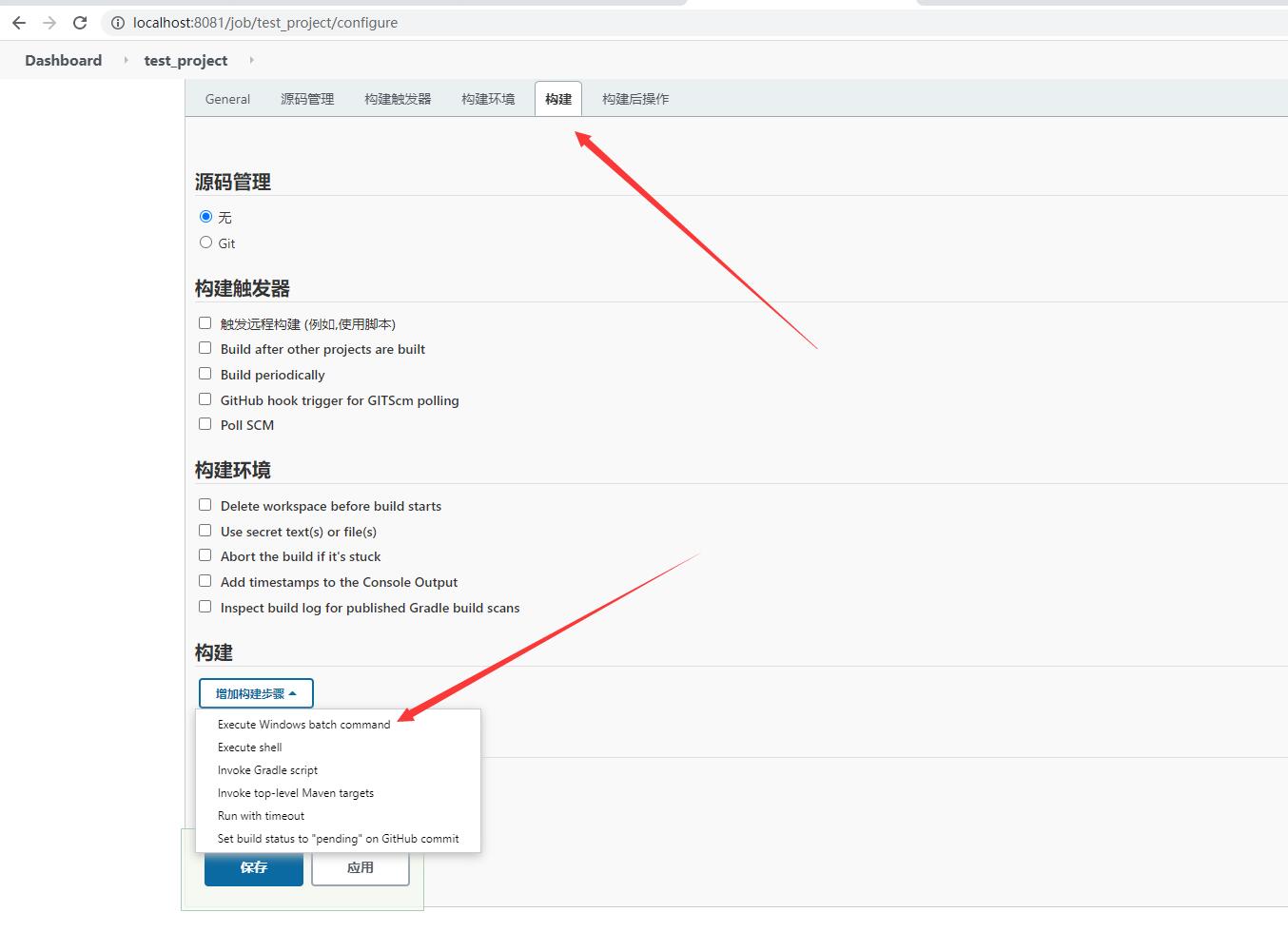 (4)切换到“构建”,选择"执行windows批处理命令"