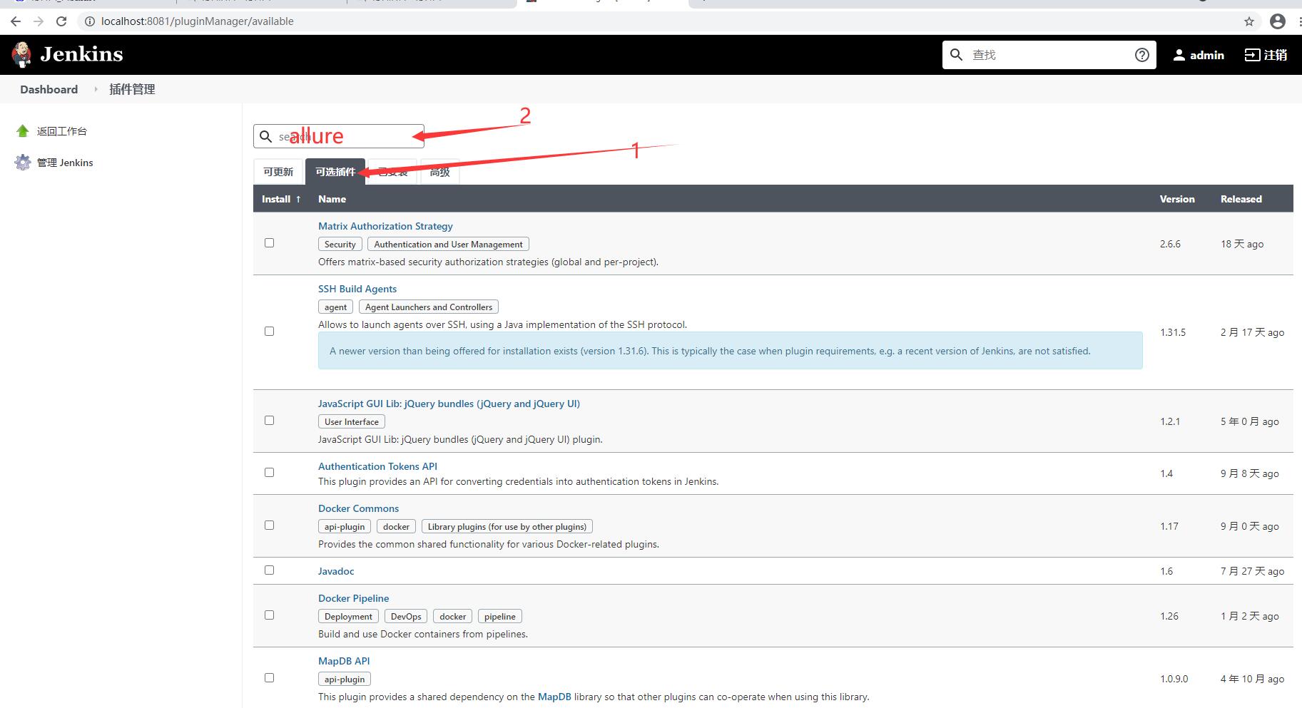 输入allure,找到插件后进行安装。安装完成后重启Jenkins