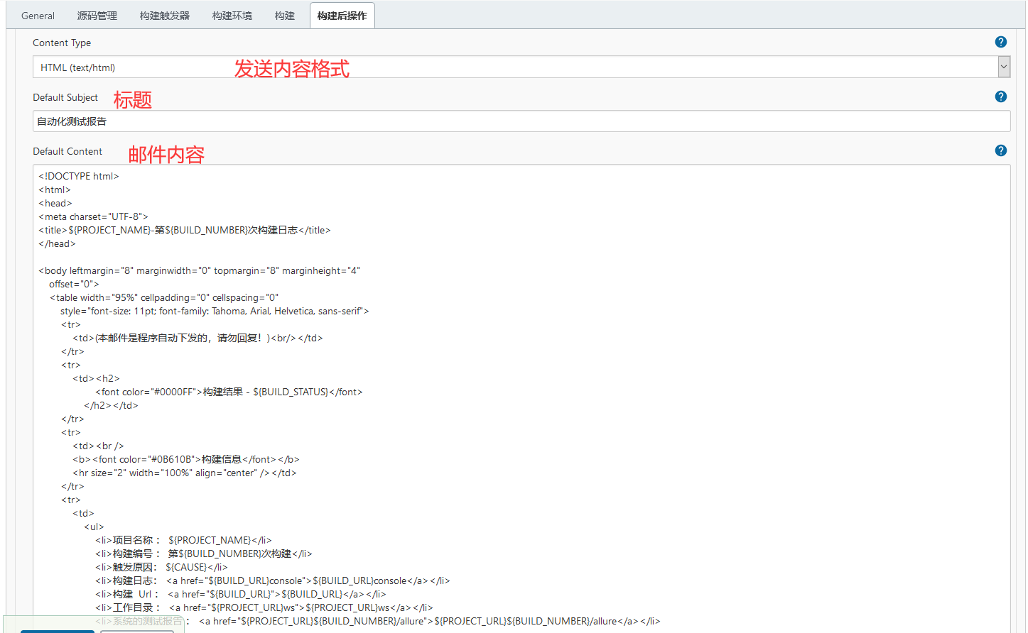 <!DOCTYPE html> <html> <head> <meta charset="UTF-8"> <title>${PROJECT_NAME}-第${BUILD_NUMBER}次构建日志</title> </head> <body leftmargin="8" marginwidth="0" topmargin="8" marginheight="4" offset="0"> <table width="95%" cellpadding="0" cellspacing="0" style="font-size: 11pt; font-family: Tahoma, Arial, Helvetica, sans-serif"> <tr> <td>(本邮件是程序自动下发的,请勿回复!)<br/></td> </tr> <tr> <td><h2> <font color="#0000FF">构建结果 - ${BUILD_STATUS}</font> </h2></td> </tr> <tr> <td><br /> <b><font color="#0B610B">构建信息</font></b> <hr size="2" width="100%" align="center" /></td> </tr> <tr> <td> <ul> <li>项目名称 : ${PROJECT_NAME}</li> <li>构建编号 : 第${BUILD_NUMBER}次构建</li> <li>触发原因: ${CAUSE}</li> <li>构建日志: <a href="${BUILD_URL}console">${BUILD_URL}console</a></li> <li>构建 Url : <a href="${BUILD_URL}">${BUILD_URL}</a></li> <li>工作目录 : <a href="${PROJECT_URL}ws">${PROJECT_URL}ws</a></li> <li>系统的测试报告 : <a href="${PROJECT_URL}${BUILD_NUMBER}/allure">${PROJECT_URL}${BUILD_NUMBER}/allure</a></li> </ul> </td> </tr> <tr> <td><b><font color="#0B610B">Changes Since Last Successful Build:</font></b> <hr size="2" width="100%" align="center" /></td> </tr> <tr> <td> <ul> <li>历史变更记录 : <a href="${PROJECT_URL}changes">${PROJECT_URL}changes</a></li> </ul> ${CHANGES_SINCE_LAST_SUCCESS,reverse=true, format="Changes for Build #%n:<br />%c<br />",showPaths=true,changesFormat="<pre>[%a]<br />%m</pre>",pathFormat=" %p"} </td> </tr> <tr> <td> <hr size="2" width="100%" align="center" /></td> </tr> <tr> <td></td> </tr> <tr> <td><b><font color="#0B610B">构建情况总览:</font></b>${TEST_COUNTS,var="fail"}<br/> <hr size="2" width="100%" align="center" /></td> </tr> <tr> <td><textarea cols="80" rows="30" readonly="readonly" style="font-family: Courier New">${BUILD_LOG,maxLines=23}</textarea> </td> </tr> </table> </body> </html>