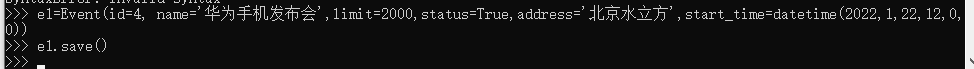 e1=Event(id=4, name='华为手机发布会',limit=2000,status=True,address='北京水立方',start_time=datetime(2022,1,22,12,0,0))