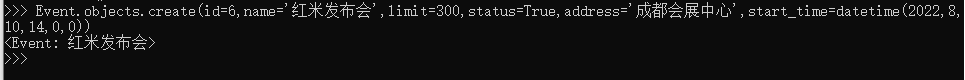 Event.objects.create(id=6,name='红米发布会',limit=300,status=True,address='成都会展中心',start_time=datetime(2022,8,10,14,0,0))