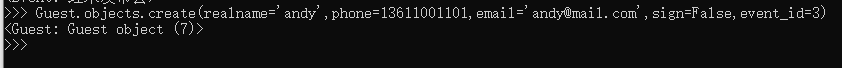 Guest.objects.create(realname='andy',phone=13611001101,email='andy@mail.com',sign=False,event_id=3)