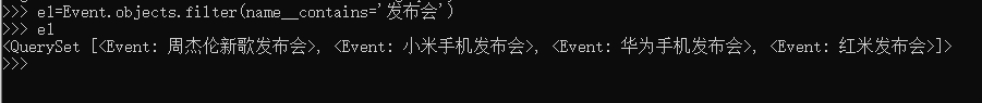 e1=Event.objects.filter(name__contains='发布会')