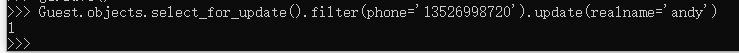 Guest.objects.select_for_update().filter(phone='13526998720').update(realname='andy')