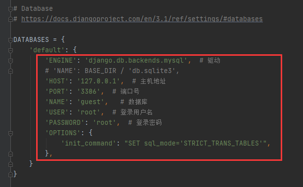 1.在../guest/settings.py文件中修改数据库配置