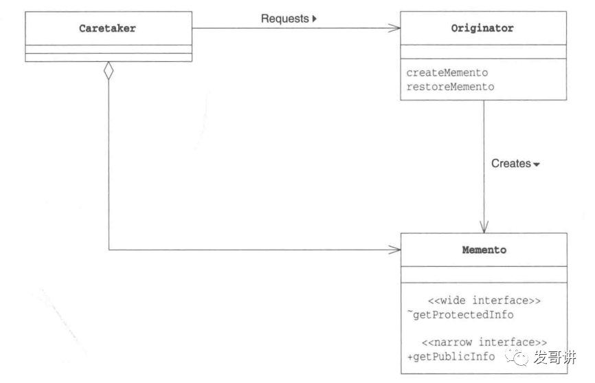 发起者可以访问memento对象,任何其他对象都不能直接与其交互。