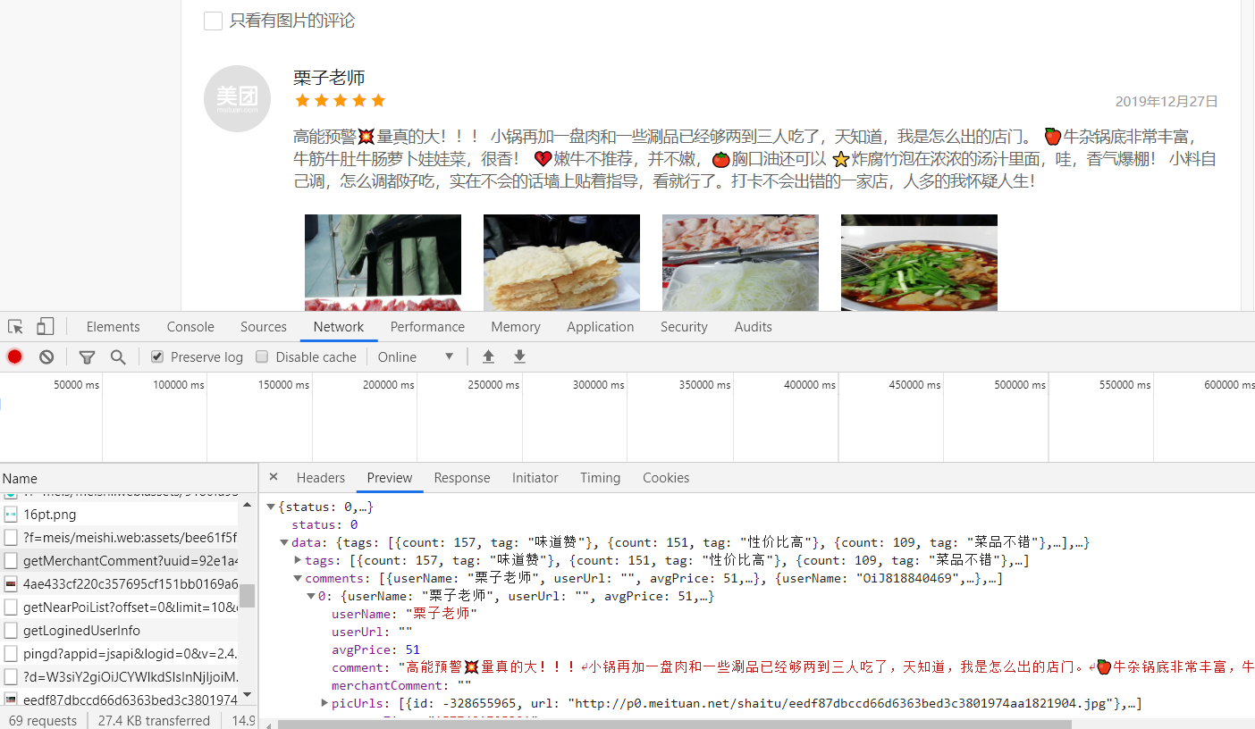 我们会抓取到非常多数据包,通过反复查找,我们会发现这个request url为:https://www.meituan.com/meishi/api/poi/getMerchantComment?uuid=0bb11f415036498cae5a.1585902206.1.0.0&platform=1&partner=126&originUrl=https%3A%2F%2Fwww.meituan.com%2Fmeishi%2F114865734%2F&riskLevel=1&optimusCode=10&id=114865734&userId=&offset=0&pageSize=10&sortType=1 的一个数据包,我们点击Previvew查看他的内容,会发现它就是我们要找的用户评论数据包: