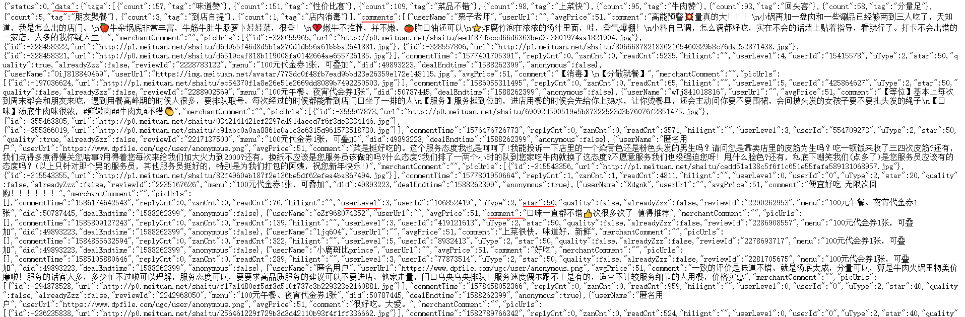 不难发现 我们想要的用户名称,用户评论,用户评分,用户评星的数据分别保存在 data//comments下面的comment,userLevel,star里面,那么我们开始用python对它进行爬取和保存吧!