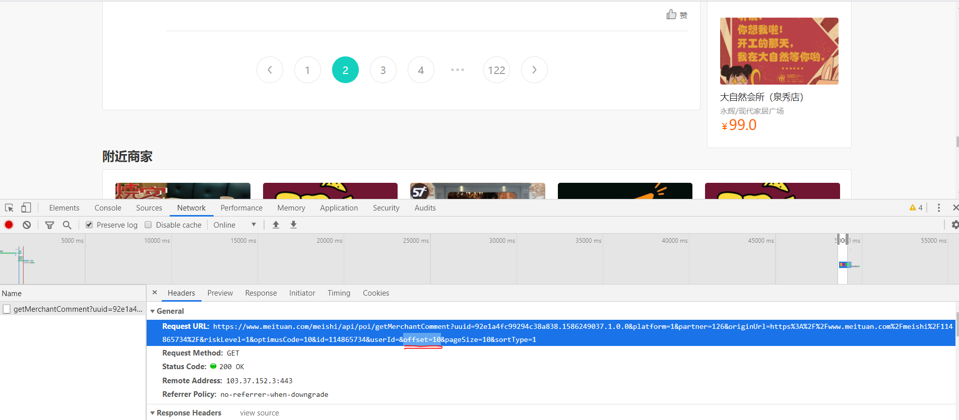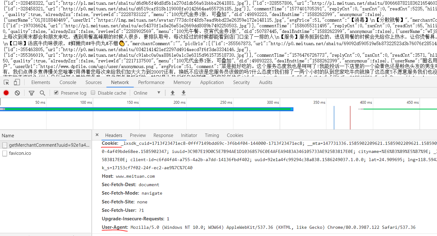 url1='https://www.meituan.com/meishi/api/poi/getMerchantComment?uuid=0bb11f415036498cae5a.1585902206.1.0.0&platform=1&partner=126&originUrl=https%3A%2F%2Fwww.meituan.com%2Fmeishi%2F114865734%2F&riskLevel=1&optimusCode=10&id=114865734&userId=&offset='