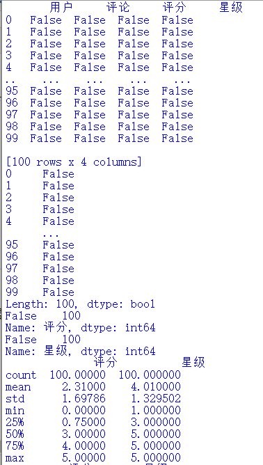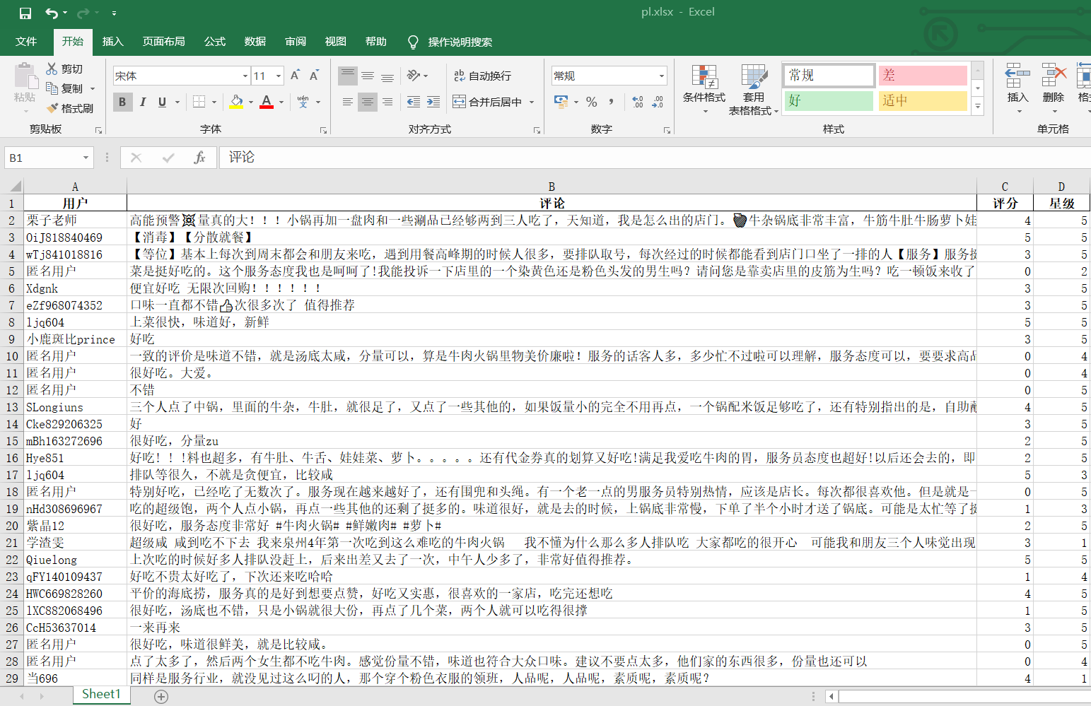 #使用json.loads函数让数据转换为可处理的json格式 a=json.loads(html.text) #可以在该数据中发现我们想要的用户,评论,评分,星级都在["data"]["comments"]中 #那我们可以用for循环去遍历这个json数据 for x in a["data"]["comments"]: #将我们想要的数据都赋值给一个变量 o=x["comment"] p=x["userLevel"] q=x["userName"] s=int(x["star"]/10) #除以10是因为星级的评判只有0~5星,再用int使它变为整形 #将数据都添加进我们先前生成的4个数组当中 pl.append(o) pf.append(p) yh.append(q) xj.append(s) #print('用户:'+str(q)+'评分:'+str(p)+'分'+'星级'+str(s)+'星') #这里检查是否提取正确 #使用pandas的DataFrame函数创建匹配列名并存放数据 df = pd.DataFrame({'用户':yh,'评论':pl,'评分':pf,'星级':xj}) #将数据保存为excel文件,存放在F:\\python\\PL中并命名为pl.xlsx df.to_excel('F:\\python\\PL//pl.xlsx',index=False)