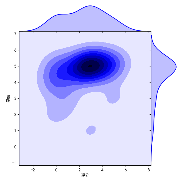 sns.jointplot(x="评分",y="星级",data=mt,kind="kde",space=0,color='b')