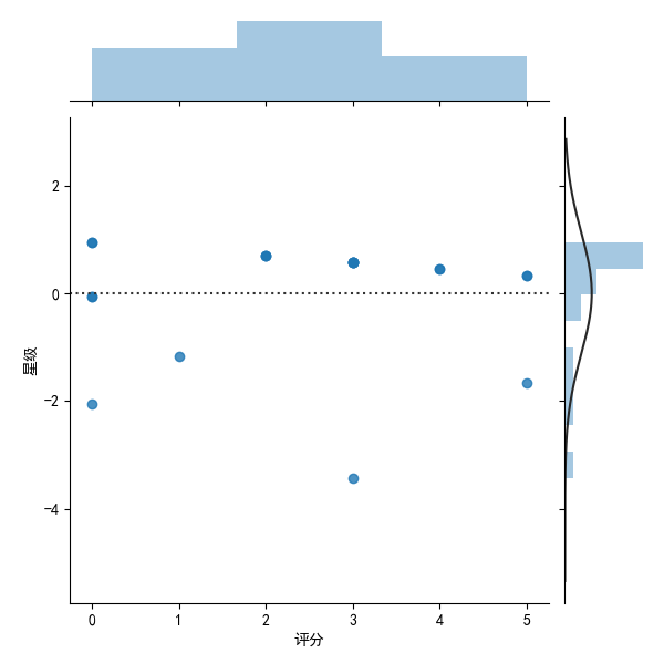 sns.jointplot(x="评分",y="星级",data=mt,kind='resid')