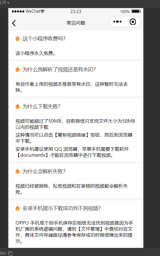 在此界面中能够查看使用小程序时可能会遇到的问题功能。通过点击“常见问题”按钮进入常见问题界面。