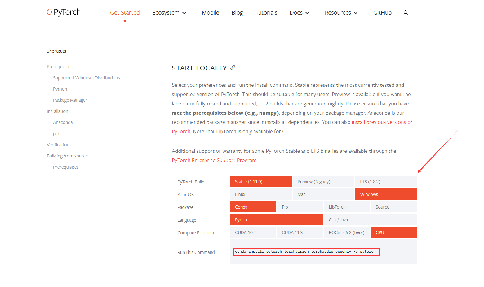 - 在官网(https://pytorch.org/get-started/locally/)搜索合适版本的pytorch,将给出的指令粘贴至anaconda prompt中,下载新版本方式如下: