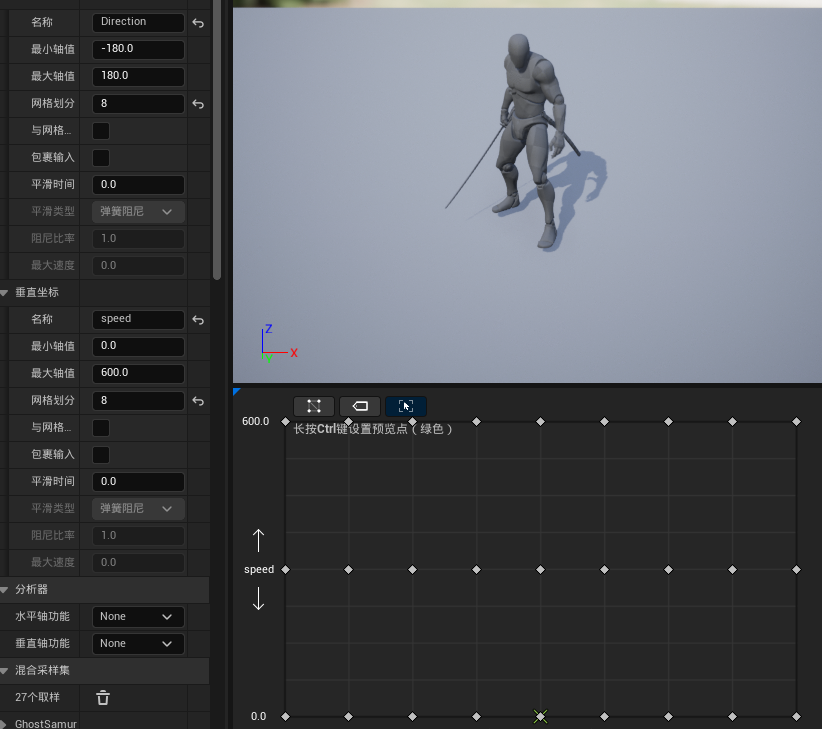 1、创建“混合空间”,设置好跑步和走路的相关动画。X轴设置成方向,-180~+180;Y轴设置成人物速度,0~600。其中网格划分都是8。