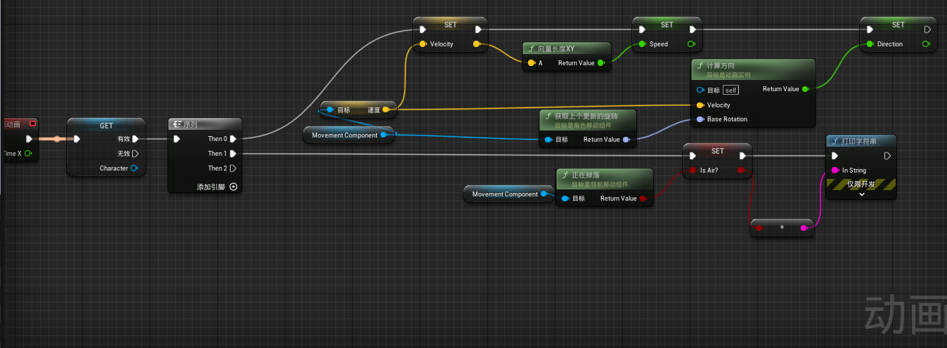 2、创建“动画蓝图”,感觉ue5变了许多。事件蓝图初始化动画和项目自带的人物蓝图一样的,事件蓝图更新动画需要改动一下。这里的speed和Direction到时候会在图表中遇到。