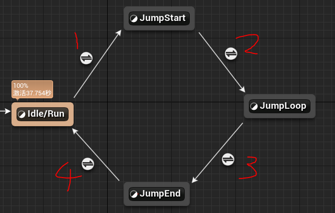 1和3(NOT布尔)处判断isAir?是否在空中;2和4就是剩余动画时间小于多少就停止执行之类的。
