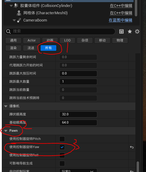 4、如果让人物识别到方向呢?这里需要在主界面点击操作的小人然后在右侧细节面板处找到,Pawn栏下面的”使用控制器旋转Yaw“,然后选中它。