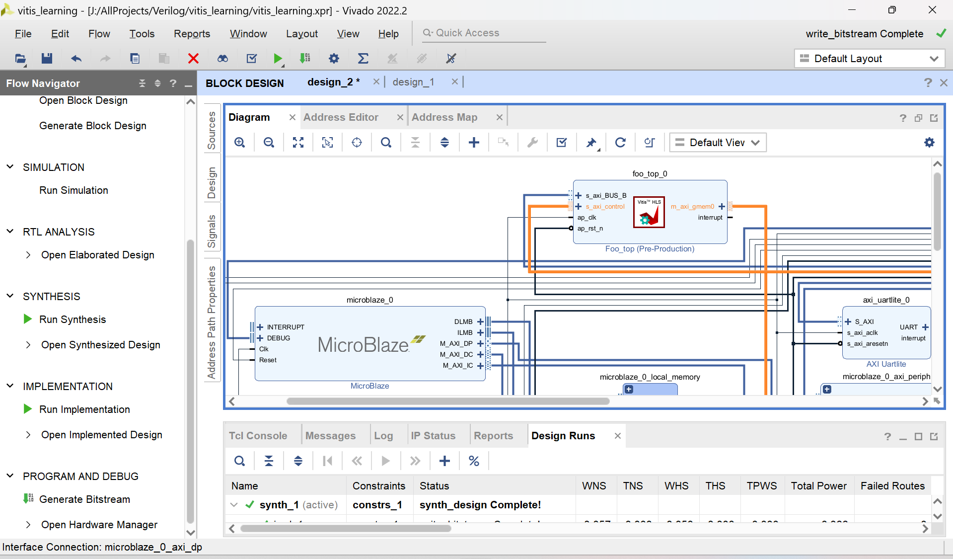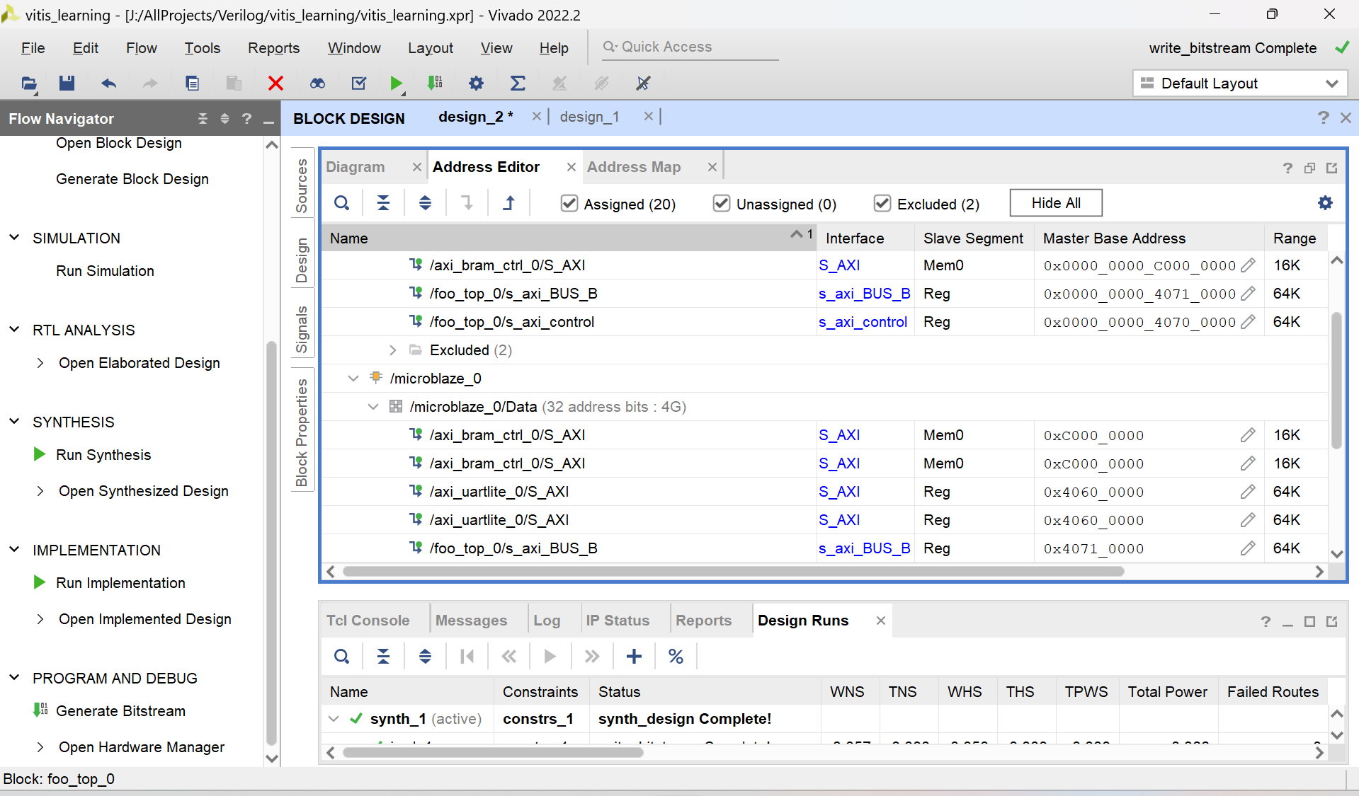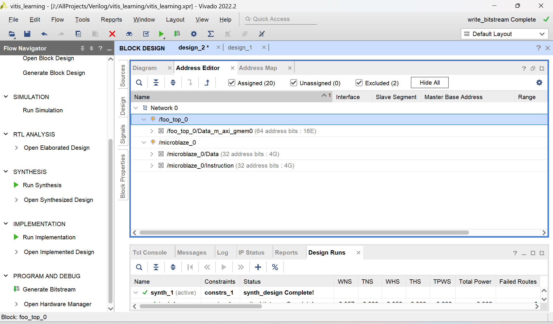 可以看到vivado生成了两部分,一部分是microblaze另一部分是自己的hls模块。代表microblaze眼中的地址映射或 hls模块中的地址映射 由于拖拽的microblaze是32位的,而hls是64位,所以写hls的地址的时候需要前面填充0