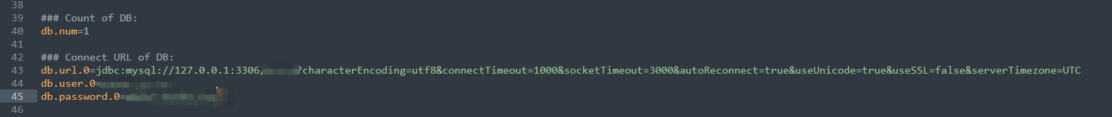 ### Count of DB: db.num=1 ### Connect URL of DB: db.url.0=jdbc:mysql://127.0.0.1:3306/nacos?characterEncoding=utf8&connectTimeout=1000&socketTimeout=3000&autoReconnect=true&useUnicode=true&useSSL=false&serverTimezone=UTC db.user.0=nacos_oychz db.password.0=nacos_oychz_Pwd