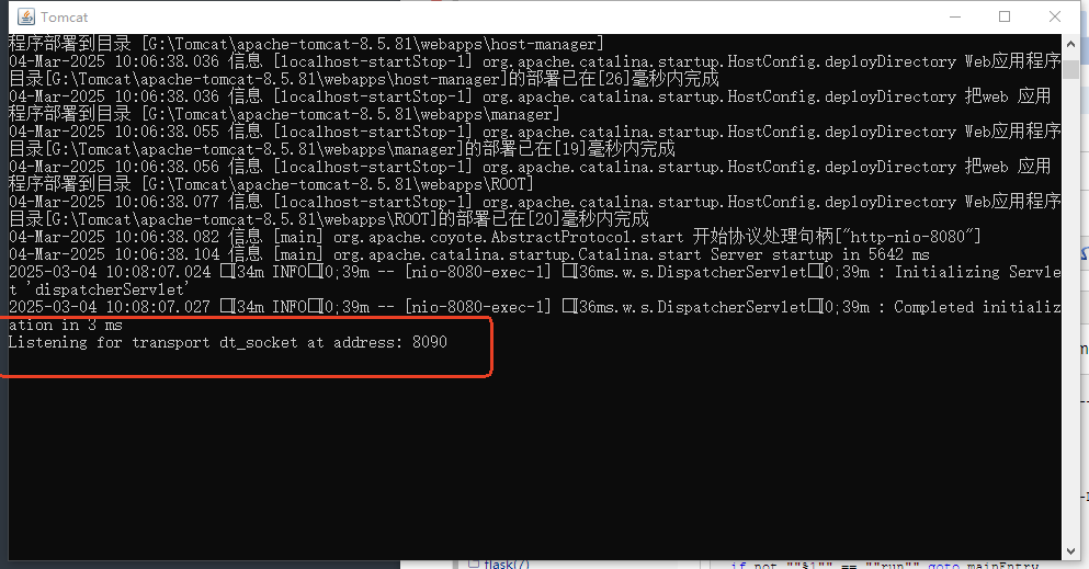 启动tomcat,发现有“Listening for transport dt_socket at address: 8090”表示成功。