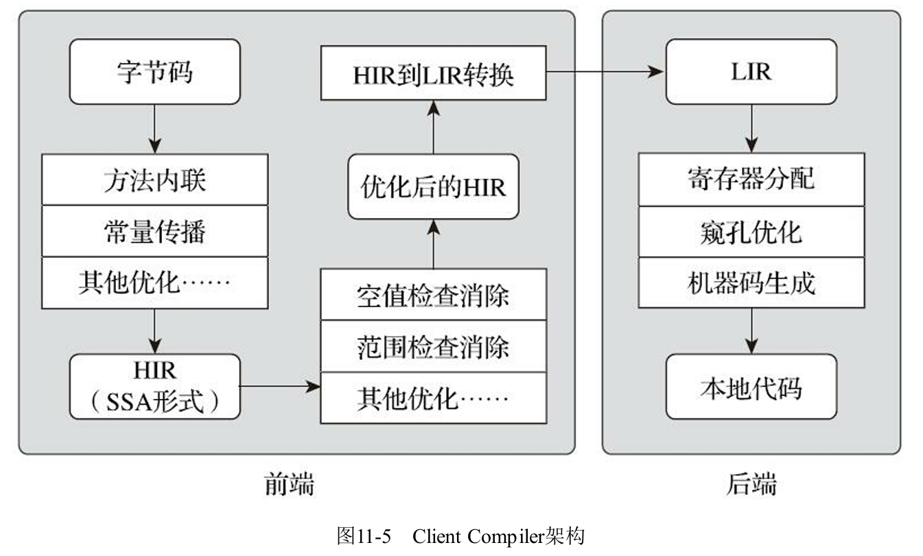 对于客户端编译器来说,它是一个相对简单快速的三段式编译器,主要的关注点在于局部性的优化,而放弃了许多耗时较长的全局优化手段。