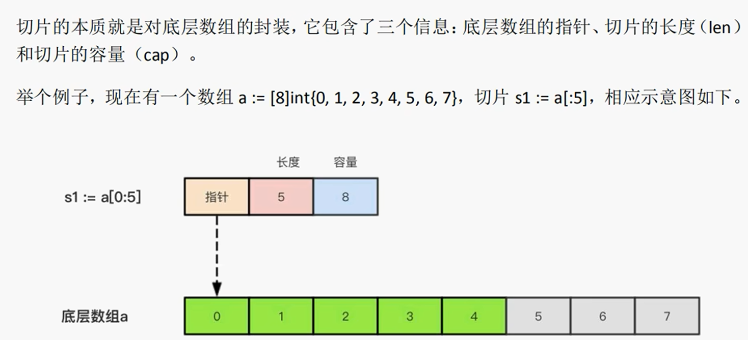 还有一个值得注意的点,和c++的vector有点类似,切片也分长度len和容量cap,长度就是切片内元素的个数,而容量是当前切片对应底层数组里,切片首元素到底层数组末尾的长度。