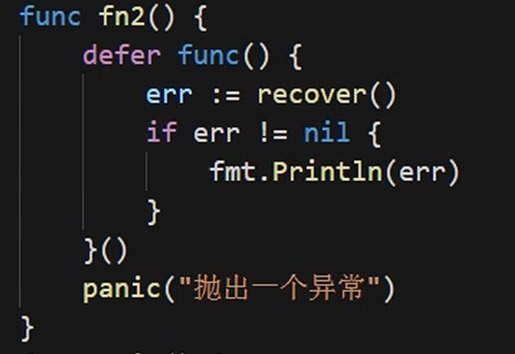 panic和recover,panic可以在任何地方抛出异常,在同函数内靠前位置defer一个匿名函数,用一个变量承接recover()如果没报错那err就是nil。