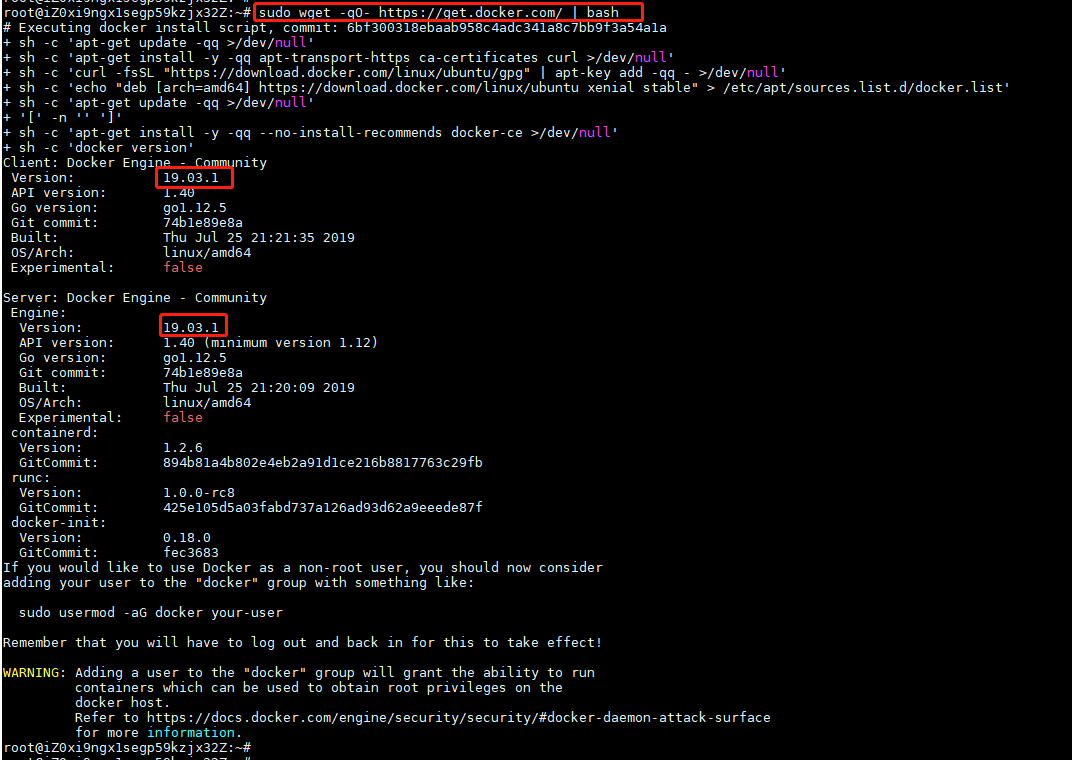 $ sudo wget -qO- https://get.docker.com/ | bash $ # 如果上面的不行,执行下面两句 $ curl -fsSL https://get.docker.com -o get-docker.sh $ sudo sh get-docker.sh $ # 安装成功执行下面语句,如果有类似回显,说明安装成功 $ docker --version Docker version 18.06.1-ce, build e68fc7a