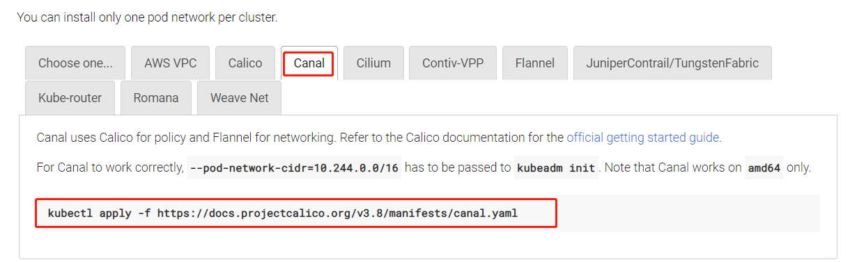 网络pod插件的功能是让pod之间能够进行网络通信。官方提供了很多的pod网络组件,而我们在kubeadm init的时候已经选择了Canal网络组件。