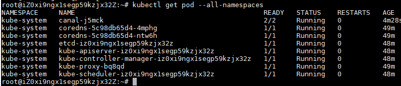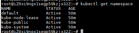 现在的namespace和pod状态如下:看时间都是50m左右,因此都是再kubeadm init操作后产生的。