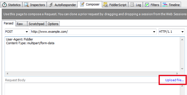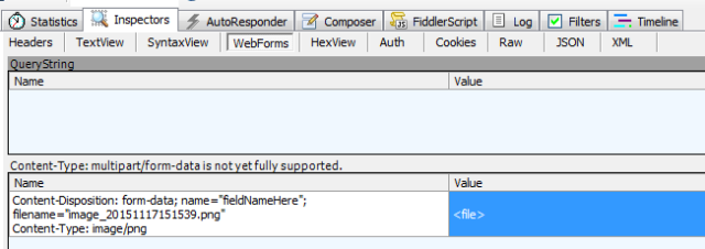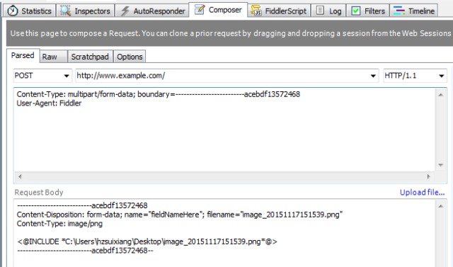 这是fiddler根据我们上传的文件自动调整生成的请求,在请求头中看到,我们需要选择一段数据作为“分割边界”(boundary属性),这个“边界数据”不能在内容其他地方出现,一般来说使用一段从概率上说“几乎不可能”的数据即可。