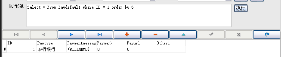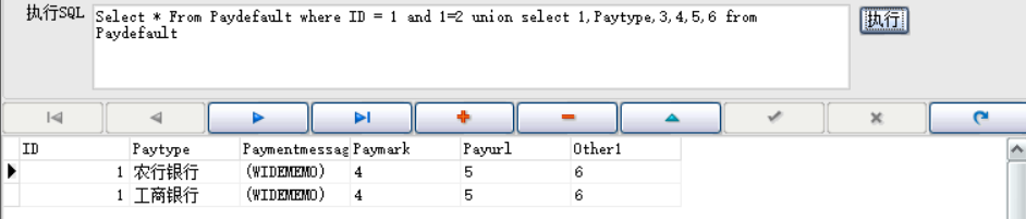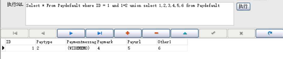 Select * From Paydefault where ID = 1 and 1=2 union select 1,Paytype,3,4,5,6 from Paydefault