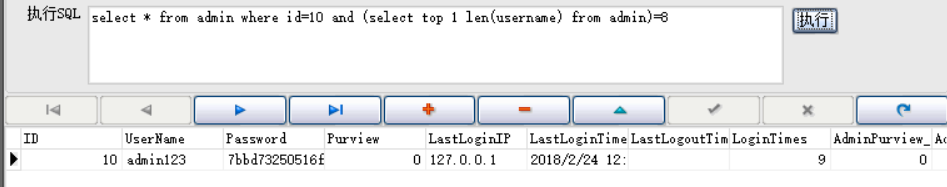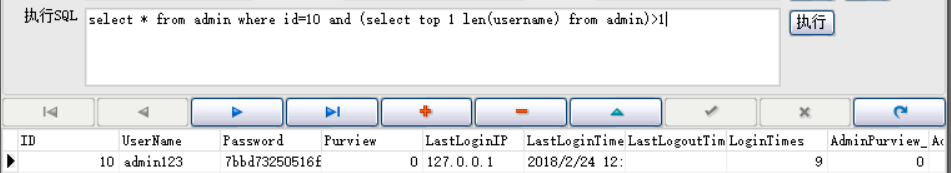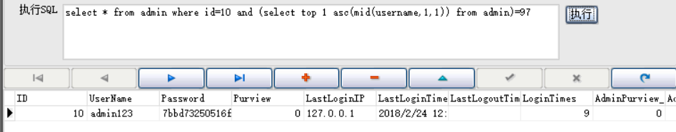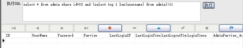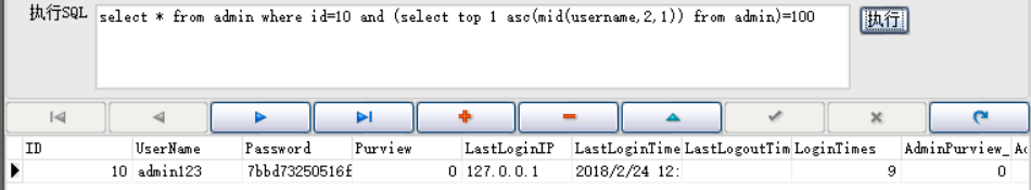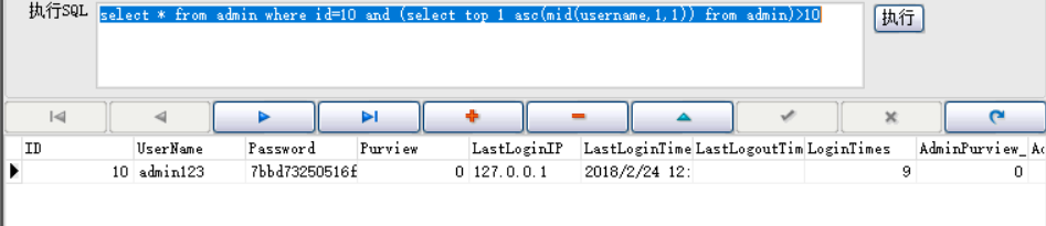 select * from admin where id=10 and (select top 1 asc(mid(username,1,1)) from admin)>10