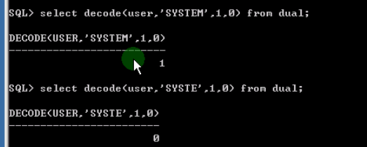 And 1=(select decode(user,’SYSTEM’,1,0) from dual) –