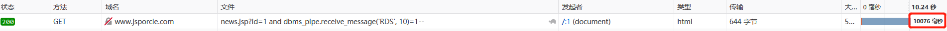 DBMS_PIPE.RECEIVE_MESSAGE函数将为从RDS管道返回的数据等待10秒。默认情况下,允许以public权限执行该包。DBMS_LOCK.SLEEP()与之相反,它是一个可以用在SQL语句中的函数。