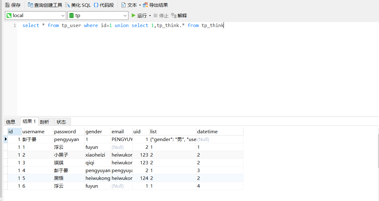输入语句判断,当前的username字段的长度大于1,所以语句成立,返回true