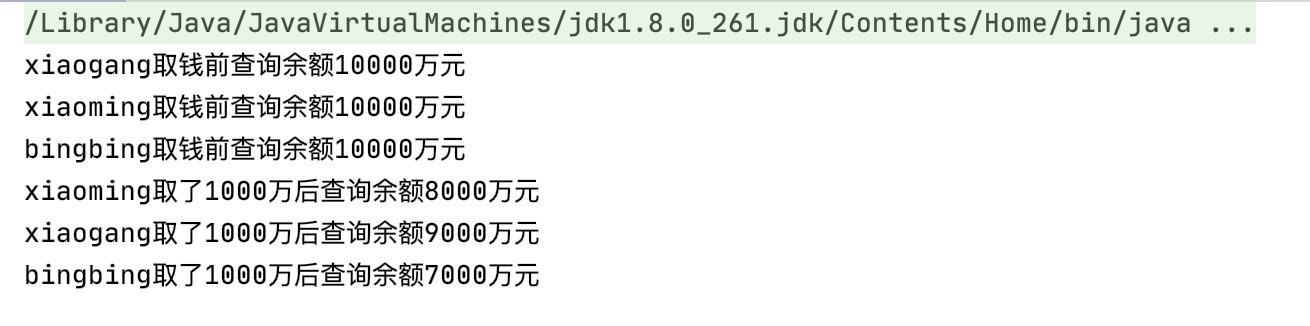 System.out.println(Thread.currentThread().getName()+"取了1000万后查询余额"+balance+"万元");