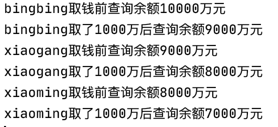 可以看出xiaoming取钱前查询余额10000万元 xiaoming取了1000万后查询余额8000万元