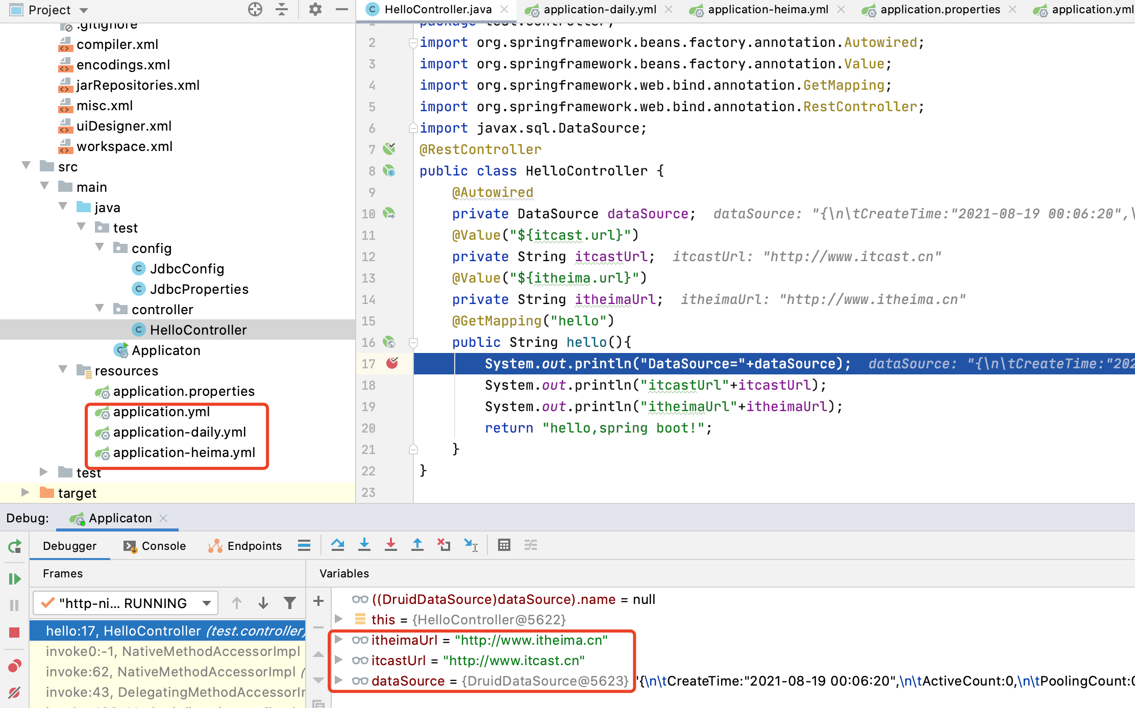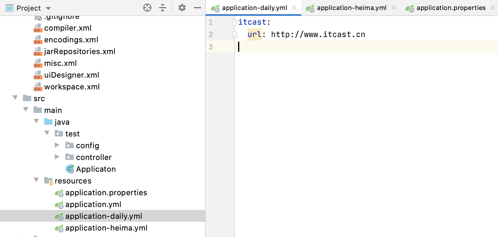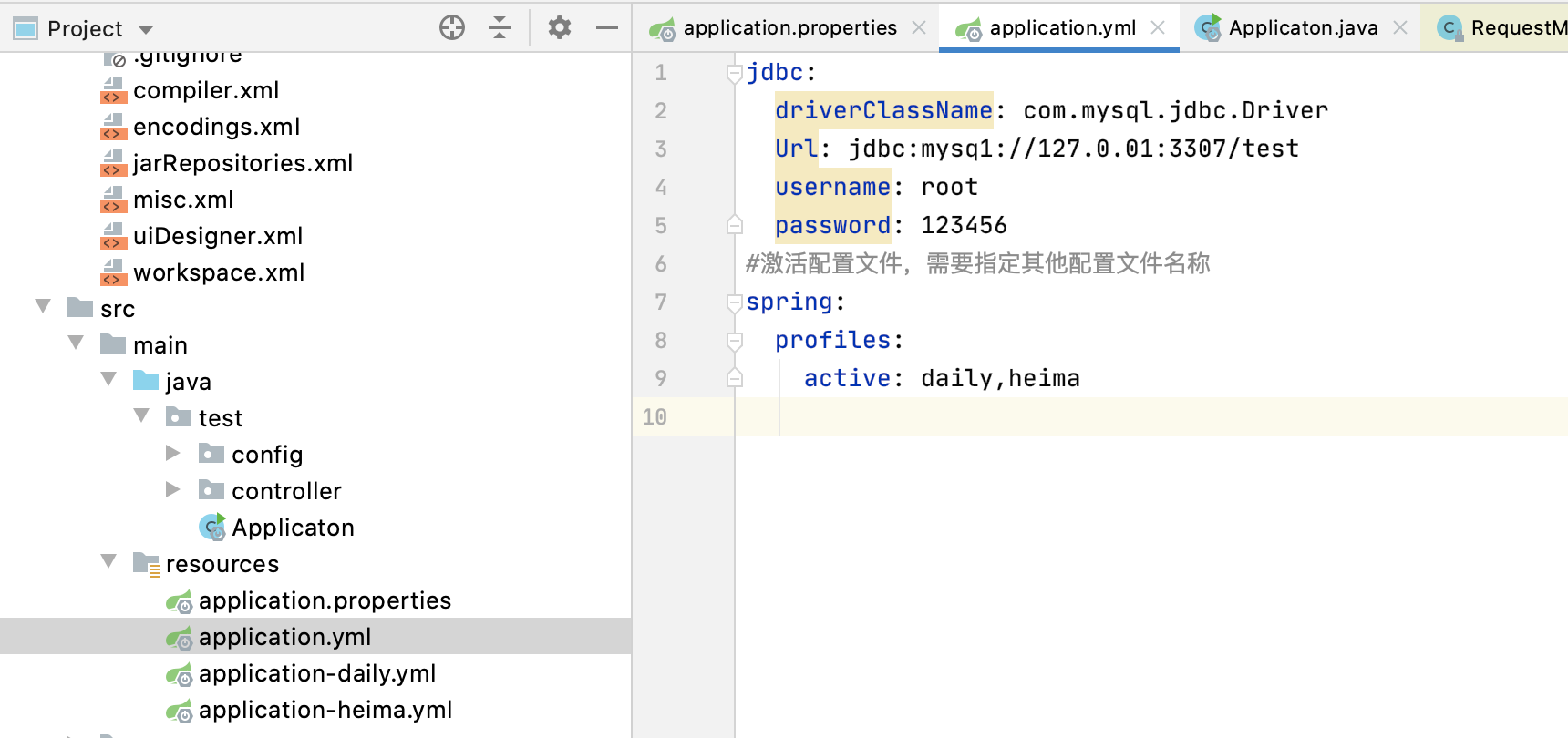 在多个配置文件时,需要将这些文件在application.yml文件中进行激活: