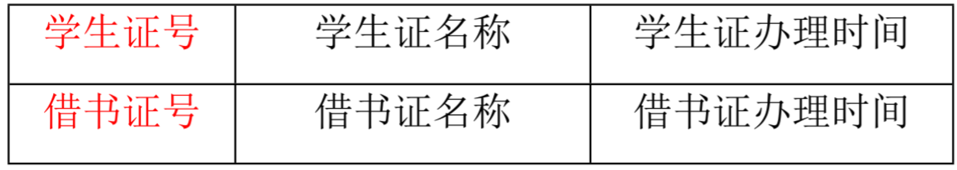 1) 借书证表:学生证号、学生证姓名、学生证办理时间、借书证号、借书证名称、借书证办理时间