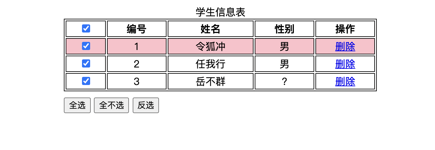 效果:表单全选、全不选、反选、移入表格颜色变为粉色