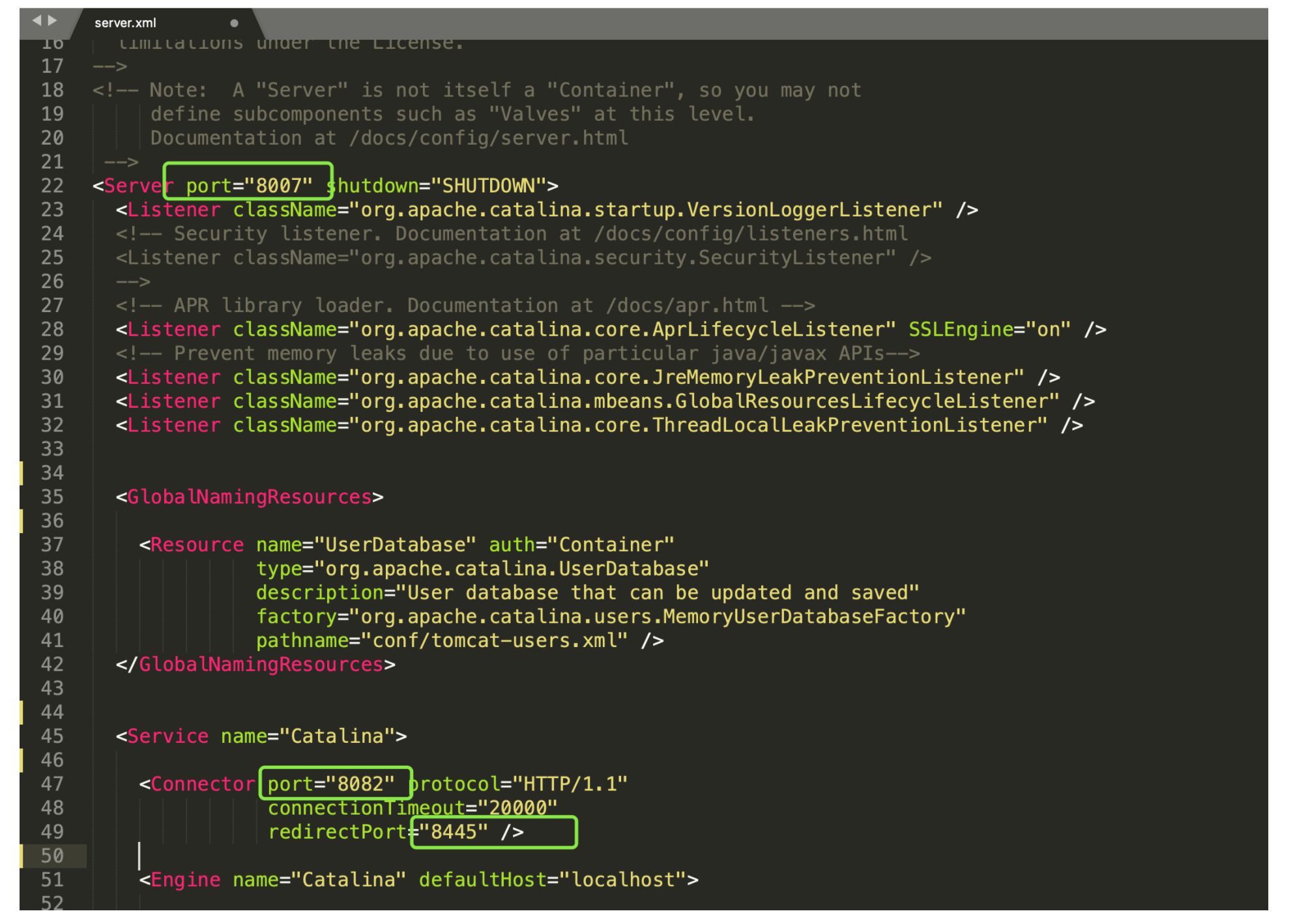修改tomcat配置文件:vim server.xml ps:每个端口号都要改, connector 为端口号