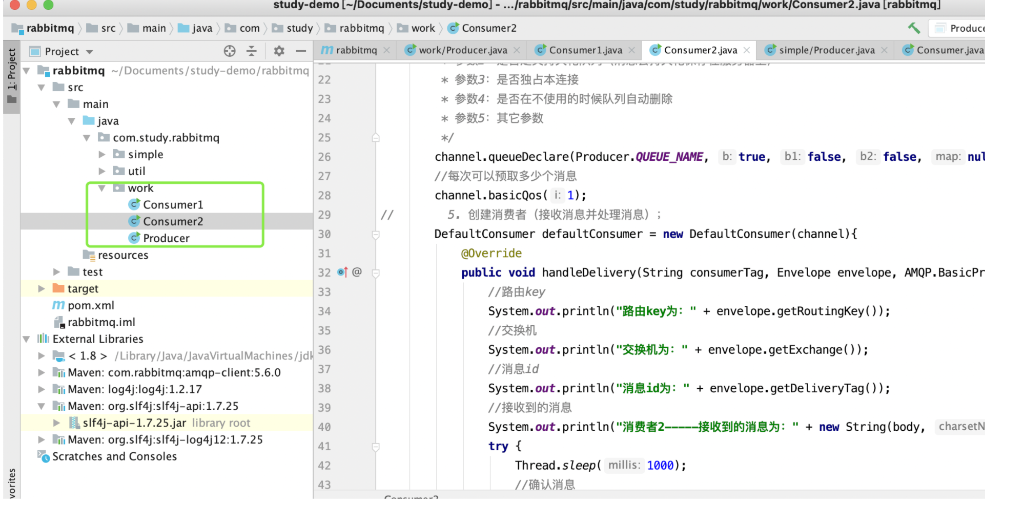channel.basicConsume(Producer.QUEUE_NAME,true,defaultConsumer);