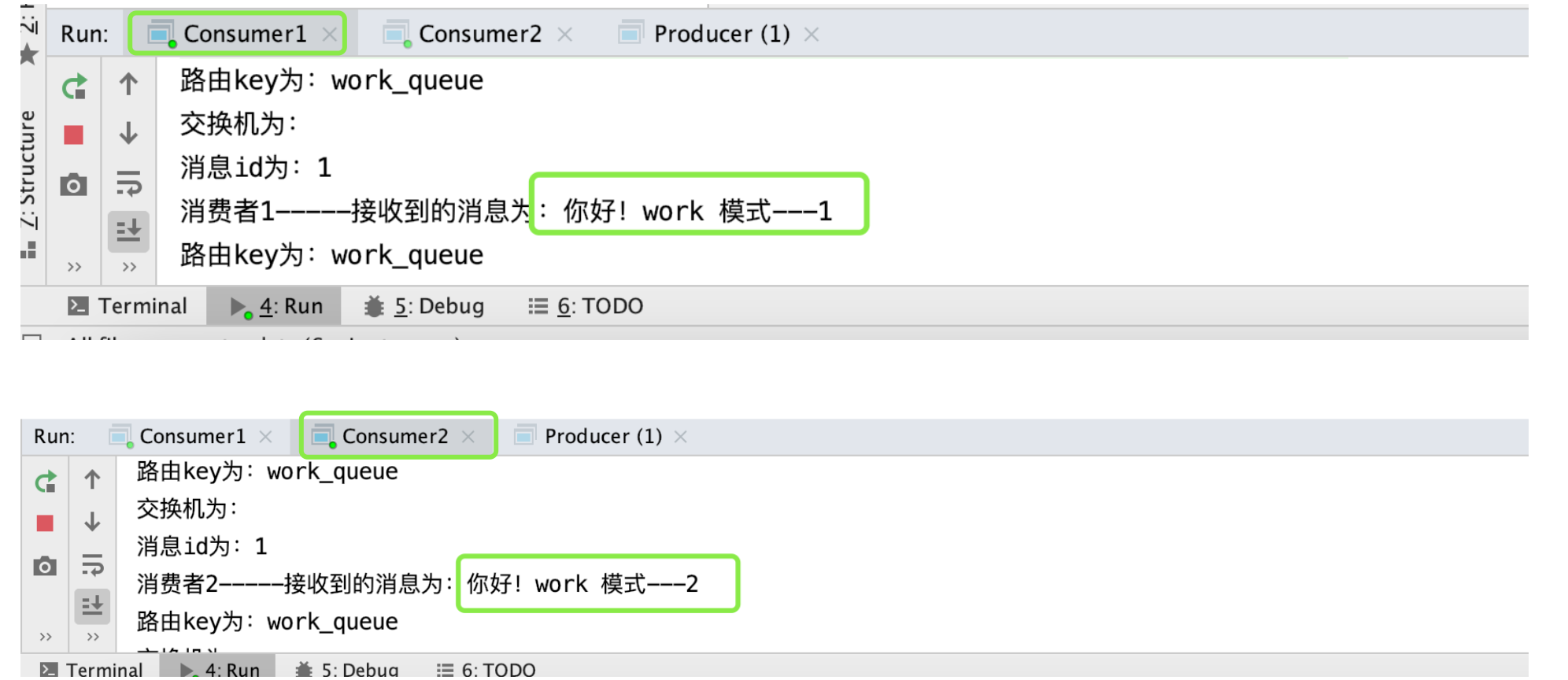 工作队列模式:一个消息只能被一个消费者接收,其它消费者是不能接收到同一条消息的。