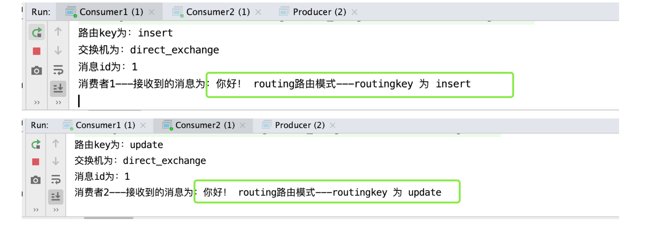 结果:先运行消费者 再运行生产者 结果发现 Consumer1 接收到的消息为 insert , Consumer2 接收到的消息为 update